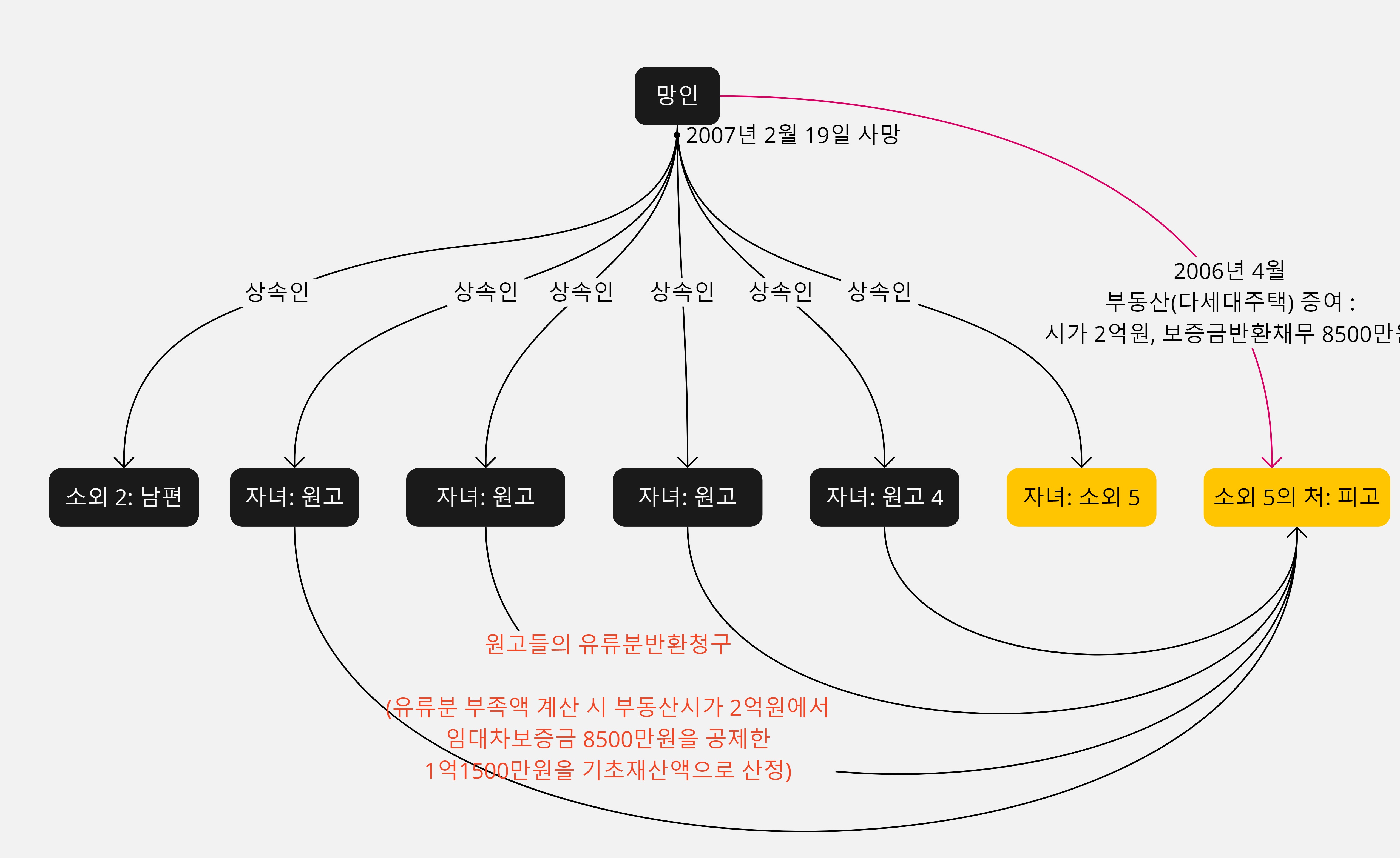 - 증여: 망인은 사망 전 2006년 4월경 소외 5의 처인 피고에게 부동산(다세대주택)을 증여하였고, 2006년 5월 9일에 피고 명의로 소유권이전등기를 마쳤습니다.
