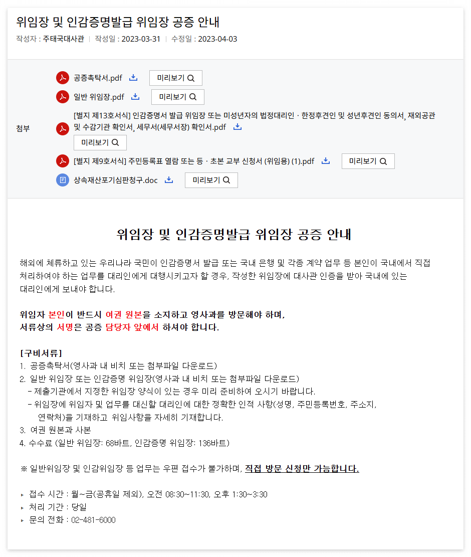 - 한국 공관(대사관/영사관)에서 공증받아야 함