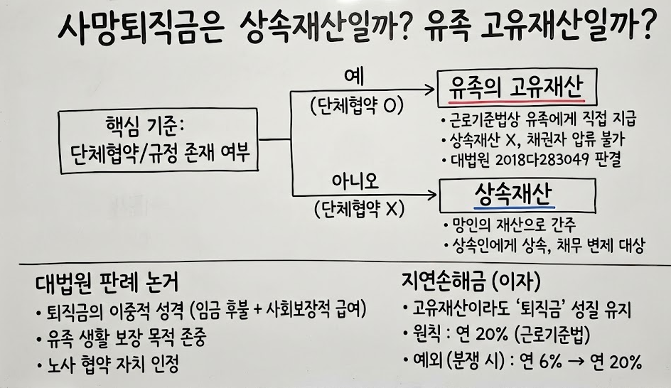오늘은 이에 대한 대법원의 확립된 판례(2018다283049)를 통해 사망퇴직금의 법적 성격과 지연손해금 문제까지 명쾌하게 정리해 드리겠습니다.